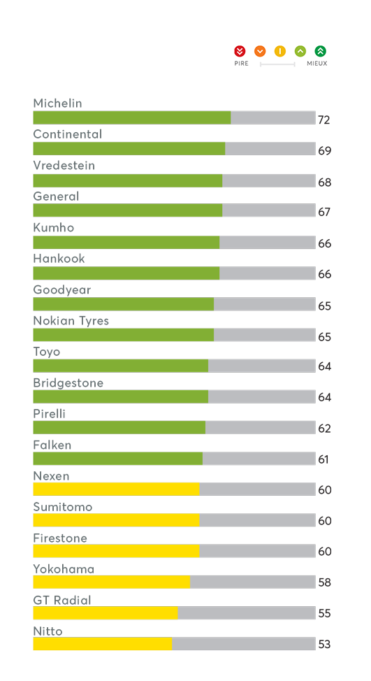 Pour vous aider à faire le bon choix lors de l’achat de pneus de remplacement, nous avons analysé les résultats d’essais de 129 modèles afin d’évaluer 18 marques pour lesquelles nous avons testé au moins quatre modèles. Le résultat final repose sur la moyenne des cotes globales attribuées aux pneus testés.