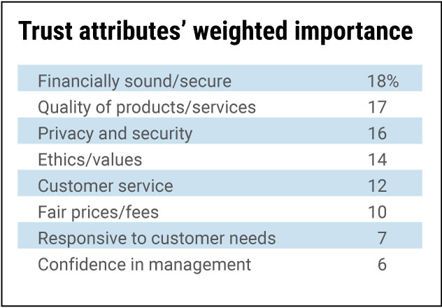Financially sound/secure received the highest weight in our study, topping our list of a financial company’s most critical trust factors. Quality of products/services took second place, followed by the commitment to protecting the privacy and security of personal data.